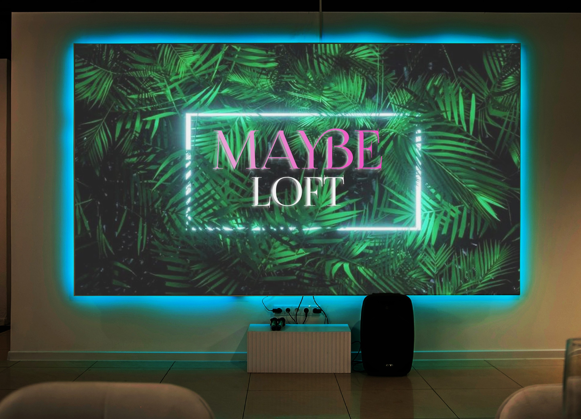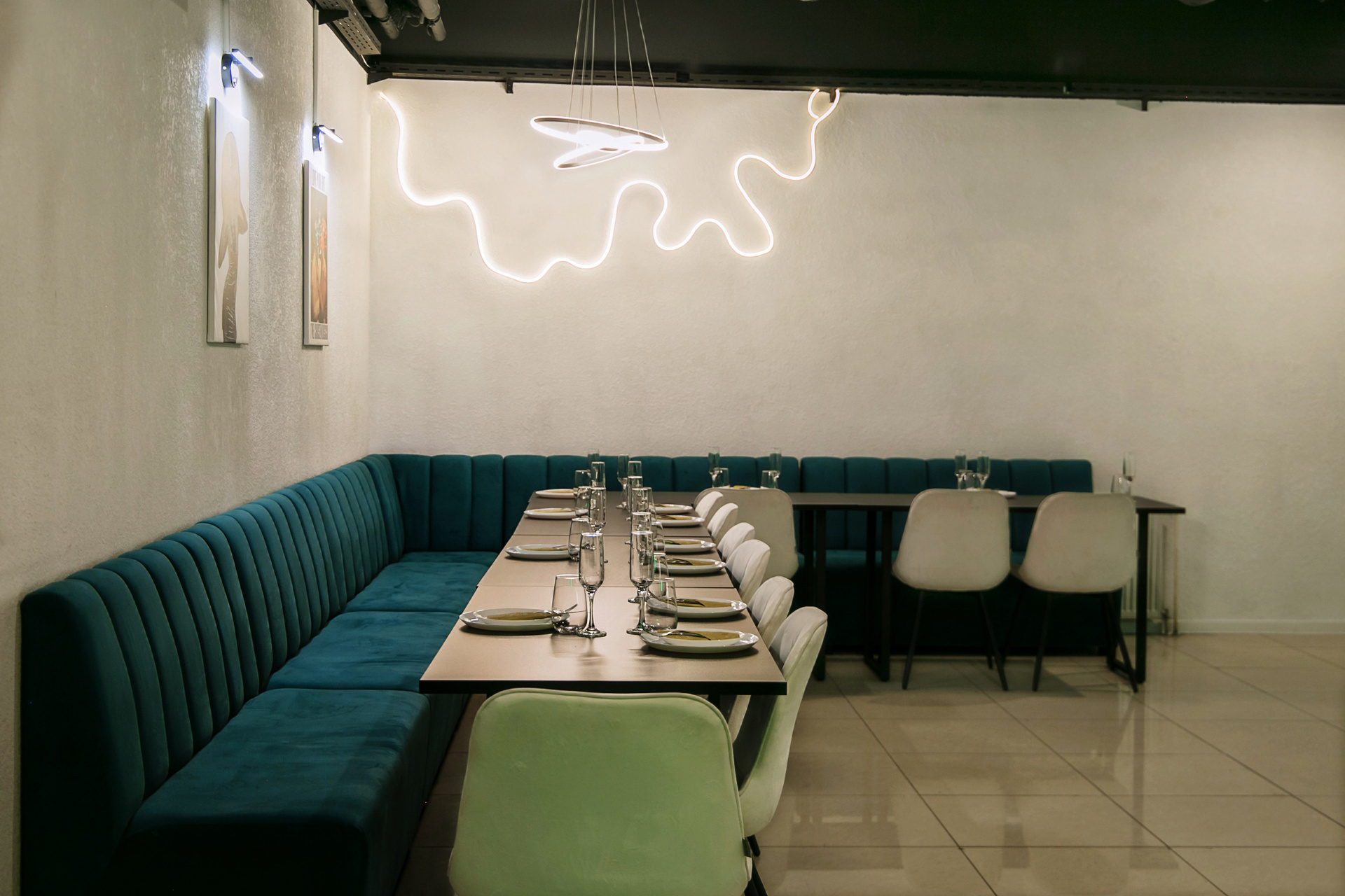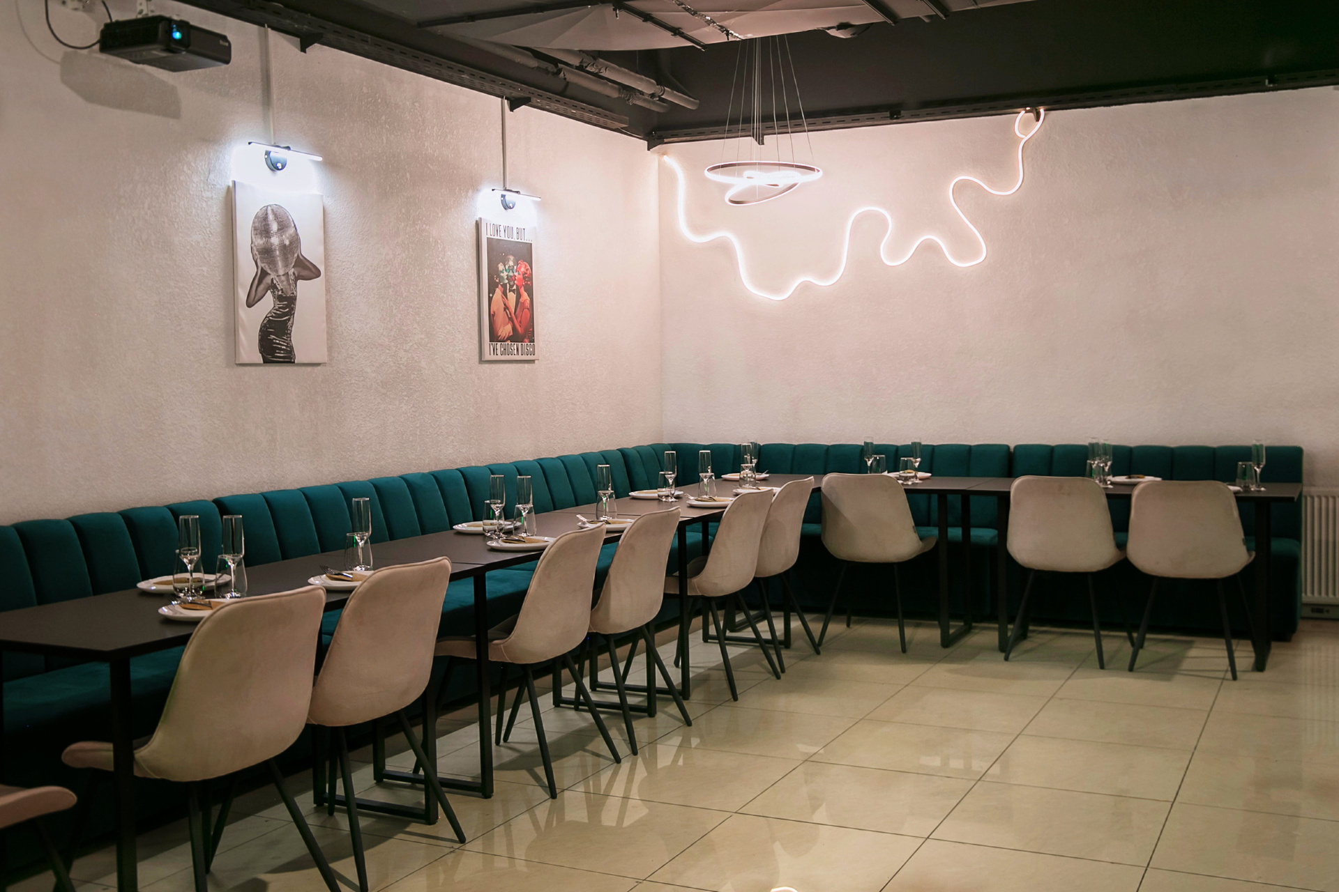 — Арт-постеры, модные светильники и неоновый декор.