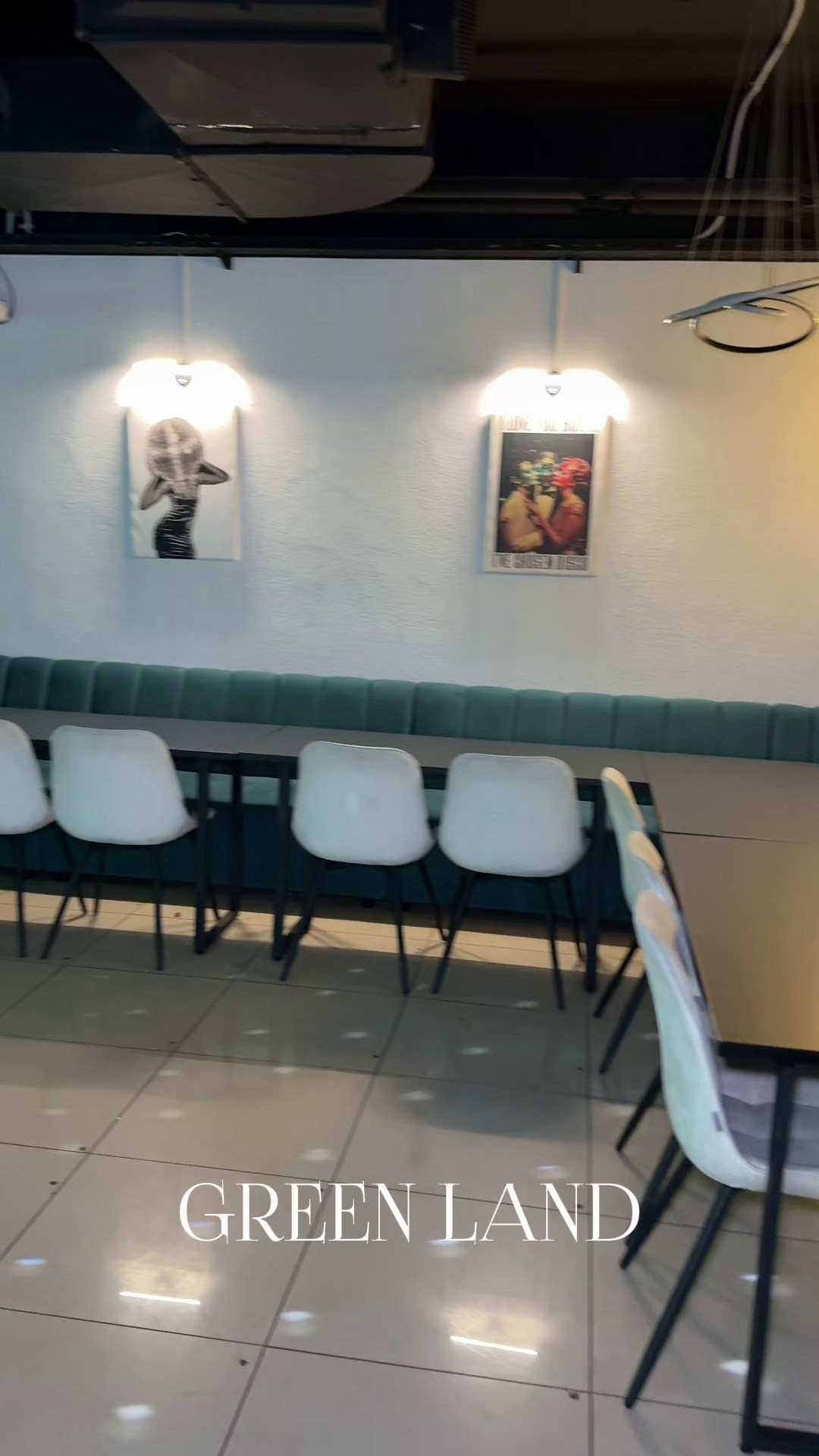 — Уютные бархатные диваны в изумрудных оттенках и белые стулья.