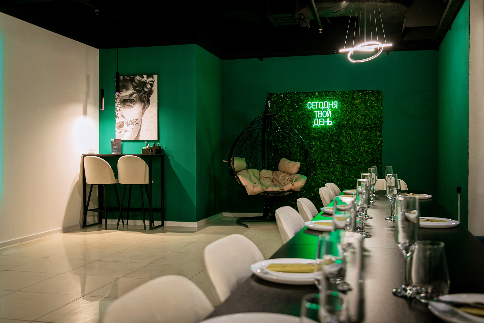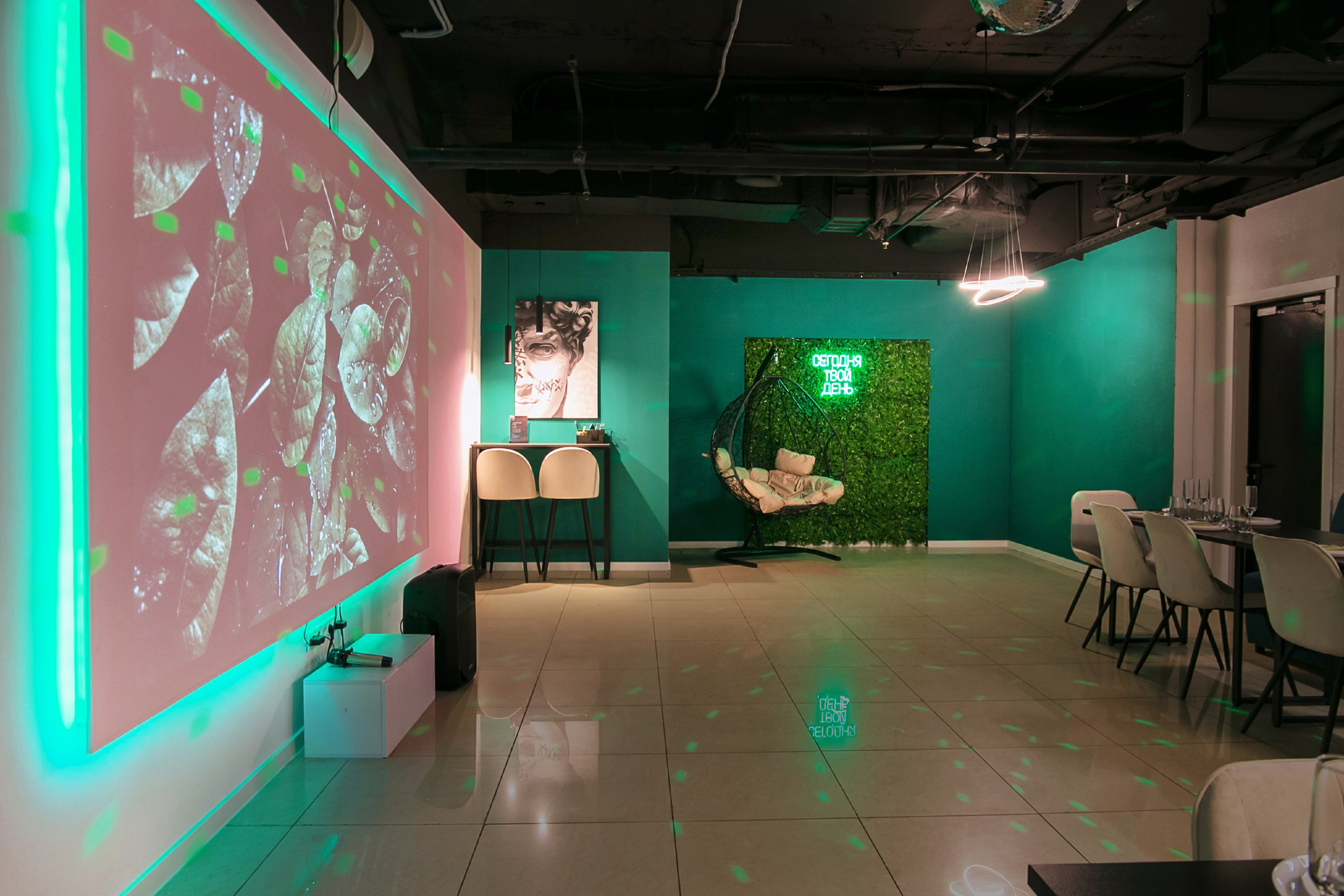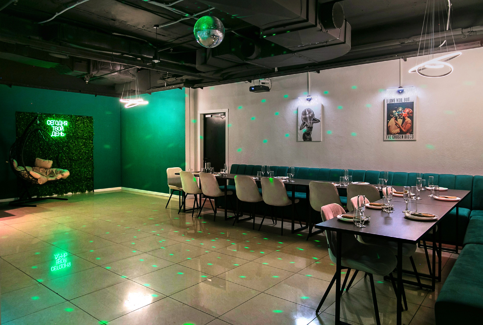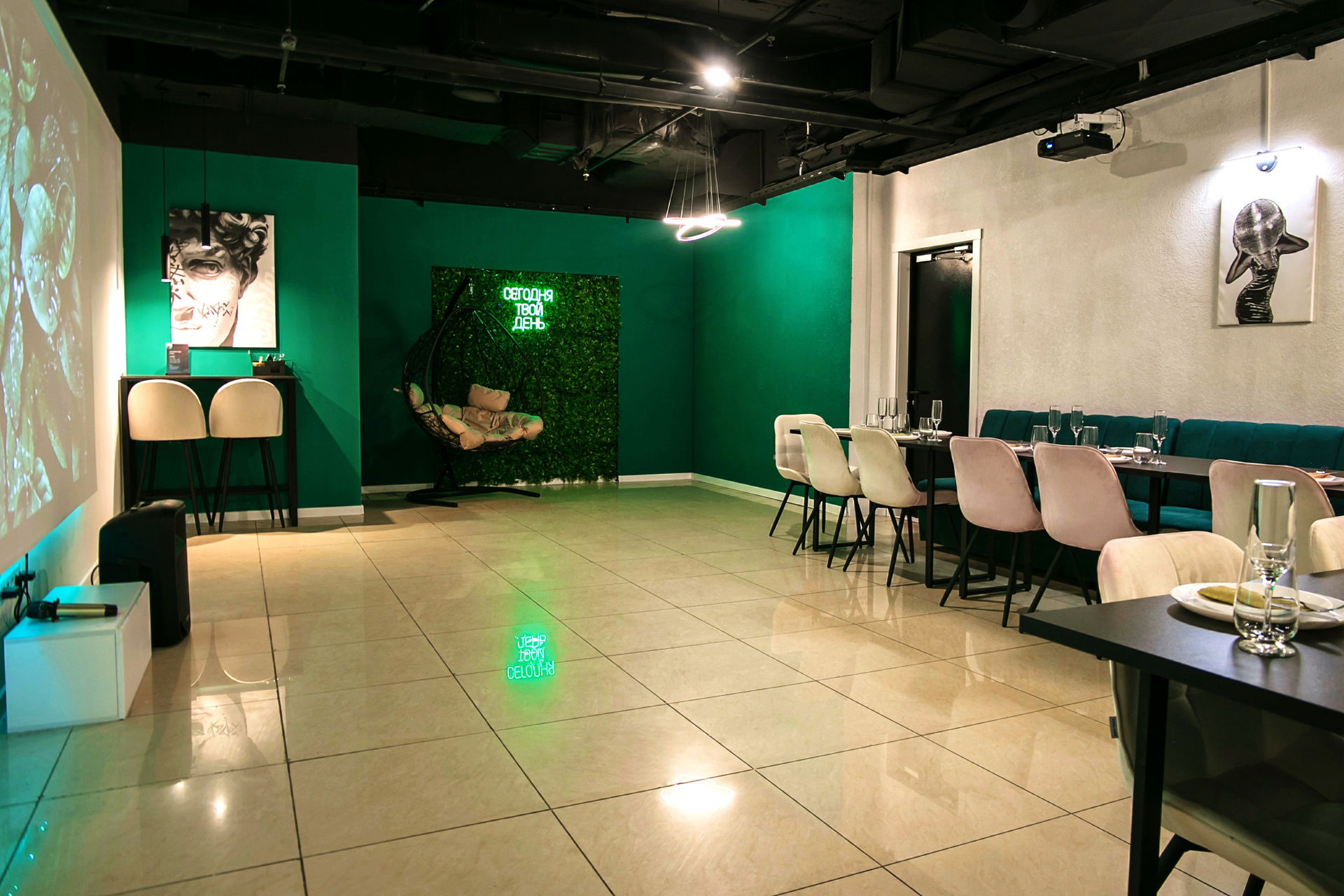 Зал ЗЕЛЁНЫЙ — стильный выбор для душевных праздников: дни рождения, корпоративы, свадьбы, семейные вечера.
